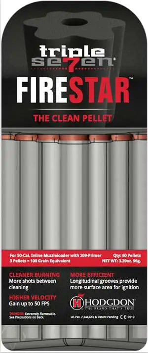 This pellet is designed for a 50-caliber inline muzzleloader used with a 209 primer. Featuring a revolutionary design utilizing a geometric star-shape to deliver: cleaner burning, higher velocity, and more efficiency.