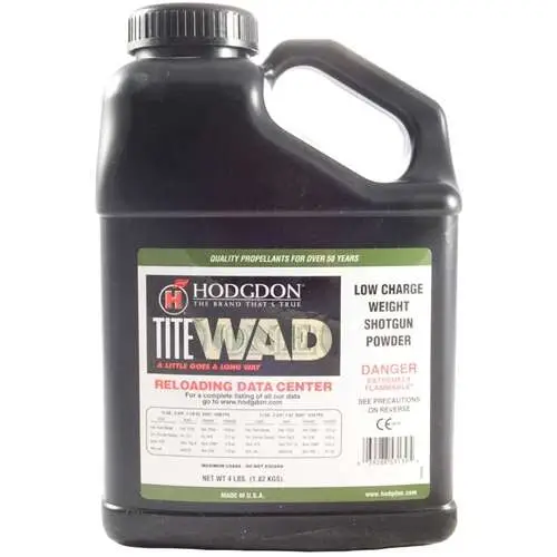 Through advanced technology, Hodgdon Powder Co. has produced a superior flattened spherical shotgun powder. Unlike spherical propellants in the past, Titewad features low charge weights, mild muzzle report, minimum recoil and reduced residue for optimum ballistic performance. This outstanding propellant designed for 12 gauge only, meters superbly and is ideal for 7/8, 1 and 1 1/8 ounce loads.