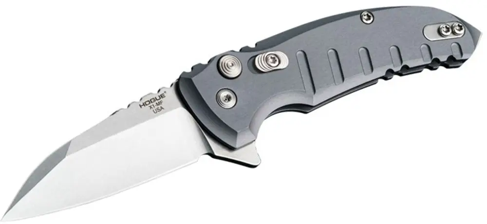 Hogue's X1 Microflip button lock folder knife features a wharnecliffe blade with a flipper and is constructed of CMP154 stainless steel. This model features a handle made of 6061-T6 anodized aluminum with an matte gray finish and a pocket clip that's ambidextrous.