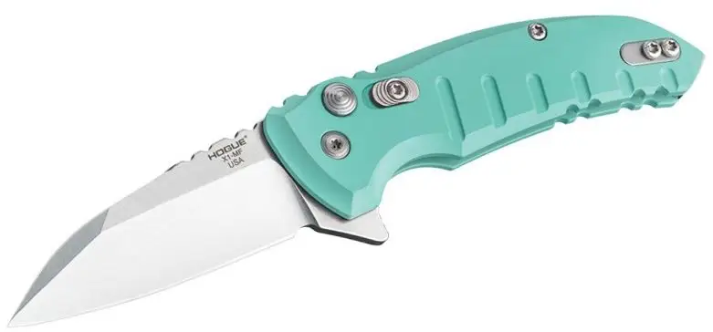 Hogue's X1 Microflip button lock folder knife features a wharnecliffe blade with a flipper and is constructed of CMP154 stainless steel. This model features a handle made of 6061-T6 anodized aluminum with an aquamarine finish and a pocket clip that's ambidextrous.