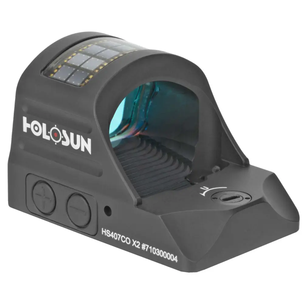 The HS407CO-X2 is an open reflex optical sight designed for pistol applications. Features include a Circle Dot, Holosuns Super LED with up to 50k hours battery life, Solar Failsafe, and Shake Awake.