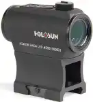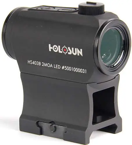 The HS403B is a small compact micro red dot optic with durable and reliable construction, unaffected by extreme weather conditions. The top mounted buttons allow for easy operation without obstructing the user's vision. It's designed for day and night use with 12 settings (10 Daylight + 2 NV) for the reticle to match the ambient lighting conditions. The sight will remember the last saved brightness setting when powered on and off. Features parallax free optical system, unlimited eye relief and shake awake technology that powers the optic on with slight movement. The green LED allows up to 50,000 hours of operation on one CR2032 battery. It may be installed on various firearms such as shotguns, pistols, air rifles and crossbows. The HS403B is compatible with standard mounts, a low mount and 1/3 Co-witness mount included.
