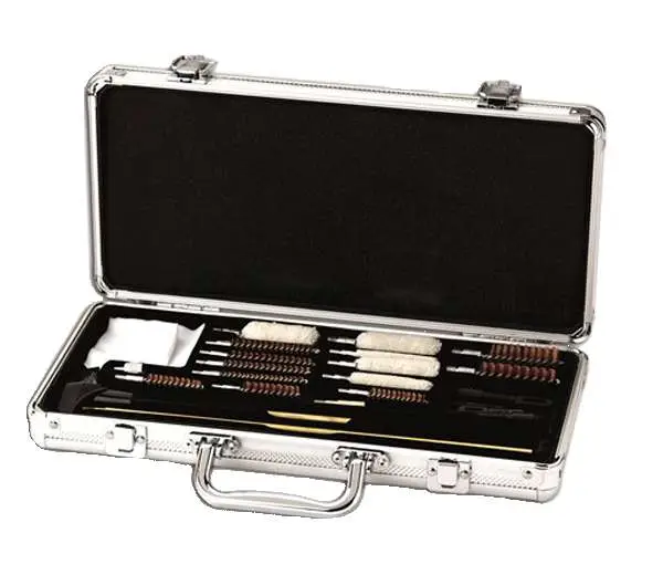 Universal gun cleaning accessory kit (UAC76). Three-piece universal brass cleaning rod. Nine phosphor bronze brushes to fit .22, .270/7mm, .30, .357/9mm, .40/10mm and .44/.45 calibers, along with 12 ga., 20 ga. and .410 bore. Five swabs for 12 ga. and 20 ga., plus .35/.38, .22/270, .40/45 calibers. Four slotted ends to fit ends to fit .410 bore to 20 ga., 16 and 12 ga., .30 caliber and .22 caliber. Shotgun and pistol adaptable. Deluxe gun cleaning accessory kit- three-piece universal brass cleaning rod (UAC102)- Eight phosphor bronze brushes to fit .22, .270/7mm, .30, .357/9mm, .40/10mm and .44/.45 calibers, along with 12 ga. and 20 ga. Six swabs for 12 ga. and 20 ga., plus .35/.38, .22/.270, .280/.32, and .40/45 calibers. Four slotted ends to fit .410 bore to 20 ga., 16 and 12 ga., .30 caliber and .22 caliber. Four knob ends for .22, .30, .38 and .44/.45 calibers. Shotgun and pistol adaptable.