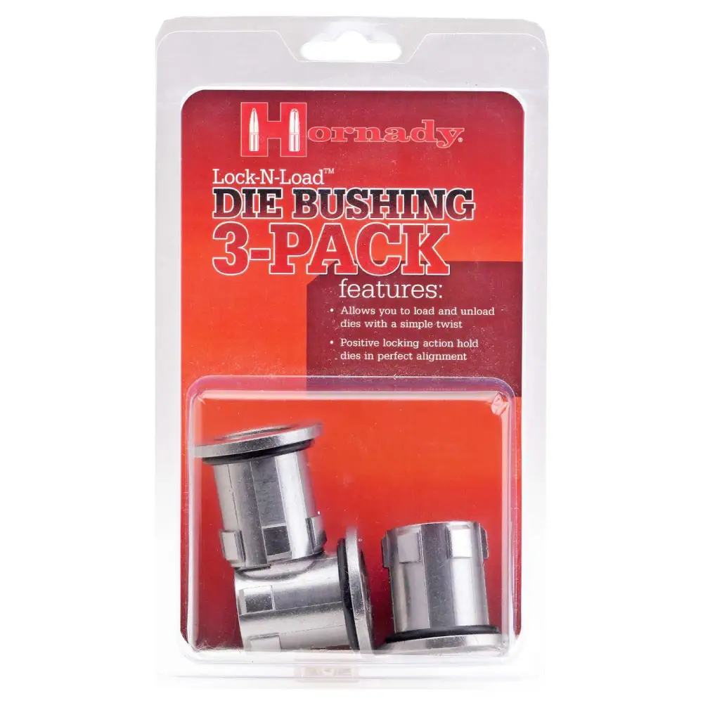 Maximize your reloading time with the Lock-N-Load quick change bushing system. The Lock-N-Load reloading system is a patented quick change bushing system that lets you change dies with a simple flick of the wrist. With Lock-N-Load technology in your reloading press, you can stop loading, change dies and start loading another caliber in seconds. This pack contains three Hornady Lock-N-Load Die Bushings.