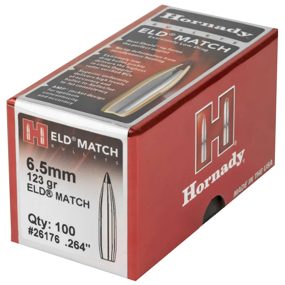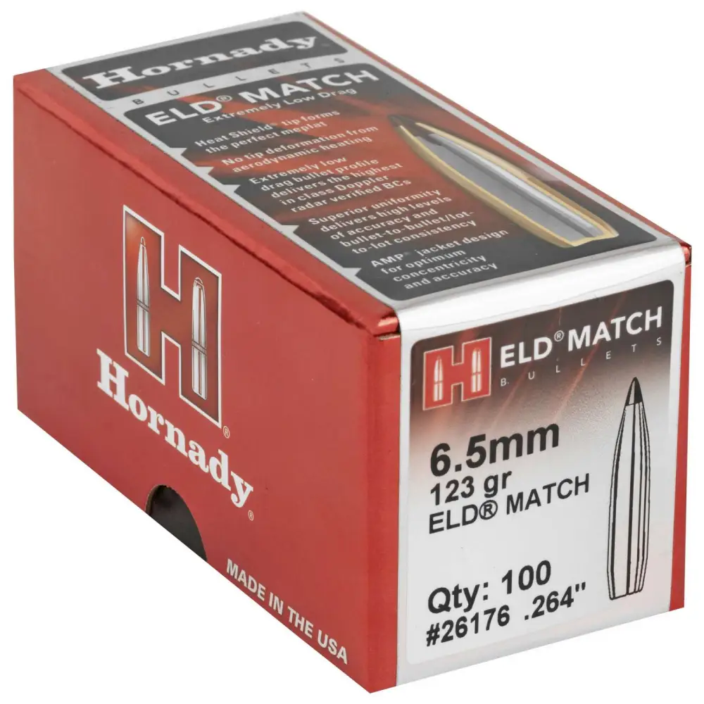 Hornady's ELD Match (Extremely Low Drag Match) bullets are technologically advanced, enhanced accuracy target bullets featuring Heat Shield tips with the ideal MEPLAT (tip point) combined with numerous design features that deliver the highest-in-class ballistic coefficients, superior accuracy and extreme consistency from bullet to bullet, lot to lot. An optimum secant ogive and boattail design along with the Heat Shield tip produce a bullet with the highest possible ballistic coefficient in its class. The tip is immune to the effects of aerodynamic heating and retains its shape to provide a perfect meplat (tip) that is always the same shape.