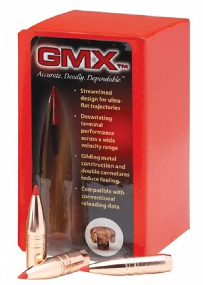 Hornady's hard-hitting and deep-penetrating, GMX bullet combines monolithic construction with pioneering ballistic design to meet the need for a premium, non-traditional bullet. Featuring a long, sleek profile with cannelures, the design reduces overall bearing surface and drag, while achieving some of the highest ballistic coefficients from monolithic, non-traditional bullets. It utilizes a tough mono-metal copper alloy which has been proven to shoot cleaner, foul less, and deliver consistent, while the hard polymer tip drives into the hollow cavity at the front of the bullet, creating a mushroom-style projectile as it travels through the animal.