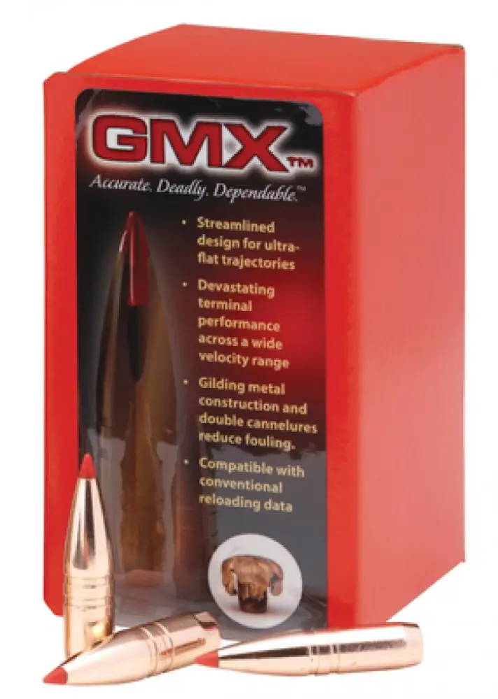 Hornady's hard-hitting and deep-penetrating, GMX bullet combines monolithic construction with pioneering ballistic design to meet the need for a premium, non-traditional bullet. Featuring a long, sleek profile with cannelures, the design reduces overall bearing surface and drag, while achieving some of the highest ballistic coefficients from monolithic, non-traditional bullets. It utilizes a tough mono-metal copper alloy which has been proven to shoot cleaner, foul less, and deliver consistent, while the hard polymer tip drives into the hollow cavity at the front of the bullet, creating a mushroom-style projectile as it travels through the animal.