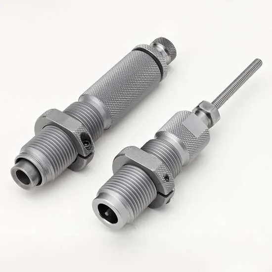 Hornady's custom grade dies provide a lifetime of reloading. They're so well crafted that they're guaranteed never to break or wear out from normal use and now they're better than ever! The spindle design features a series of light threads out on the spindle and spindle colet. This design eliminates spindle slippage and takes the knuckle busting out of tightening the spindle lock while making spindle adjustments a snap.