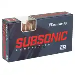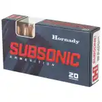 Hornady Subsonic Ammunition is designed for accuracy and performance below the speed of sound. It features a Sub-X (Subsonic- Expanding) bullet with a lead core. The long grooves in its gilding metal jacket combine with the bullet's flat profile and the patented Flex Tip insert within its hollow point cavity to help it expand reliably at low velocities.