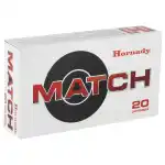 Hornady's Match ammunition features extremely tight tolerances and strict quality control for superior lot-to-lot consistency. Cases are carefully selected based on wall thickness uniformity, internal capacity, case weight and consistent wall concentrically, while the powder is matched carefully to each specific load for optimal pressure, velocity and consistent accuracy.