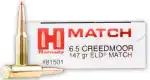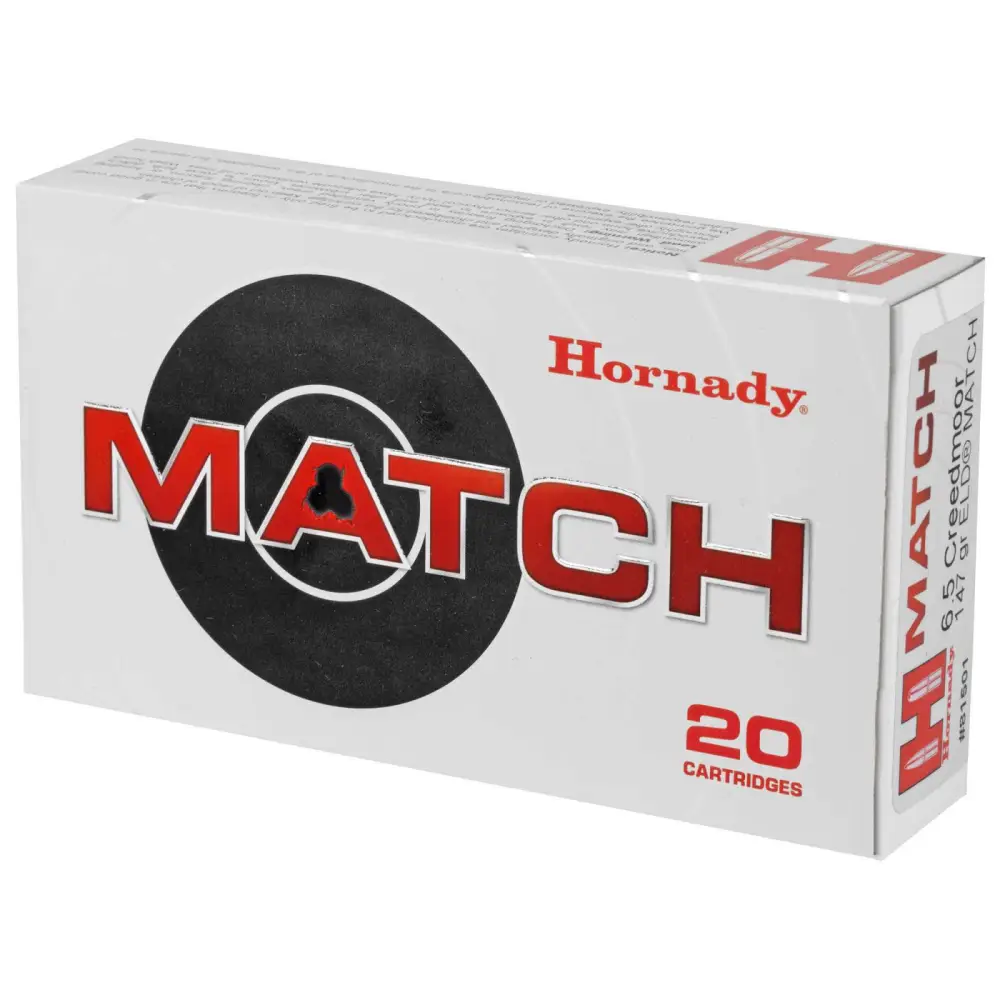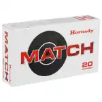 Hornady's Match ammunition features extremely tight tolerances and strict quality control for superior lot-to-lot consistency. Cases are carefully selected based on wall thickness uniformity, internal capacity, case weight and consistent wall concentrically, while the powder is matched carefully to each specific load for optimal pressure, velocity and consistent accuracy.