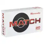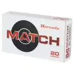 Hornady's Match ammunition features extremely tight tolerances and strict quality control for superior lot-to-lot consistency. Cases are carefully selected based on wall thickness uniformity, internal capacity, case weight and consistent wall concentrically, while the powder is matched carefully to each specific load for optimal pressure, velocity and consistent accuracy.