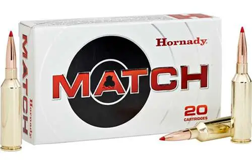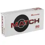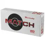 Hornady's Match ammunition features extremely tight tolerances and strict quality control for superior lot-to-lot consistency. Cases are carefully selected based on wall thickness uniformity, internal capacity, case weight and consistent wall concentrically, while the powder is matched carefully to each specific load for optimal pressure, velocity and consistent accuracy.