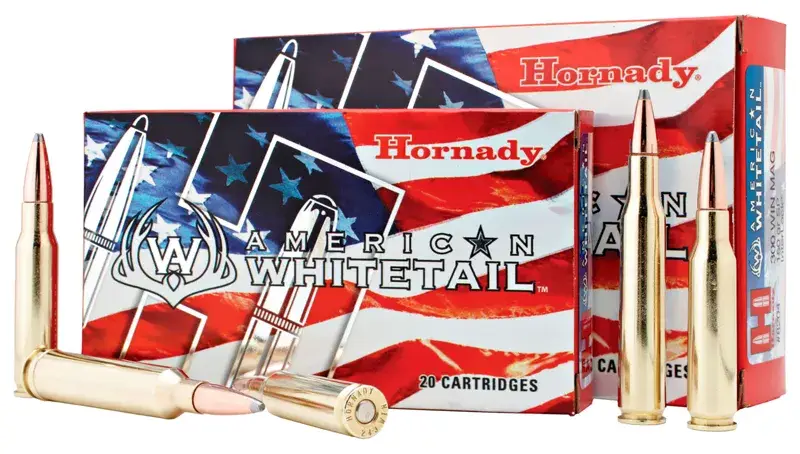 Opening day of deer season comes only once a year. Make sure you're ready when the big one steps out and load-up with Hornady American Whitetail ammunition. The InterLock bullet features exposed lead tips for controlled expansion and hard-hitting terminal performance. Its pioneering secant ogive design and exclusive InterLock ring helps keep the core and jacket locked together during expansion to retain mass and energy. The American Whitetail utilizes the highest quality cases and primers available for optimum pressure and consistency.