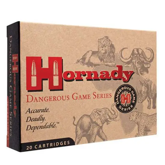 Hornady Dangerous Game Series ammunition is designed specially for a large game and safari hunting. The Dangerous Game Solid bullets are made with a hard lead/antimony alloy cone, surrounded by a copper clad steel jacket. The bullets feature a flat meplat for straighter penetration and create more energy transfer than a simple round profile bullet.
