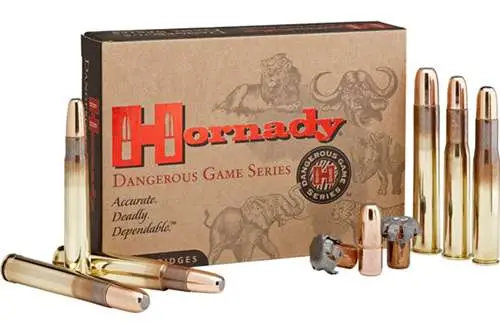 Hornady's Dangerous Game Series ammunition is designed specifically for large game and safari hunting. All ammunition is designed to work well in all rifles, and meticulous attention was devoted to ensure that ammunition regulate properly in both classic doubles and their younger counterparts. The DGX Bonded (Dangerous Game eXpanding) bullets are made with a hard lead/antimony alloy cone, surrounded by a copper clad steel jacket. These bullets feature a flat meplat for straighter penetration and create more energy transfer than a simple round profile bullet.