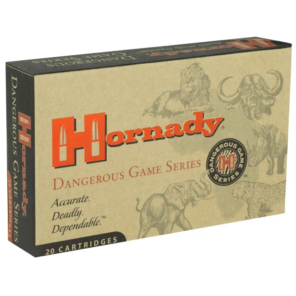 Hornady's Dangerous Game Series ammunition is designed specifically for large game and safari hunting. All ammunition is designed to work well in all rifles, and meticulous attention was devoted to ensure that ammunition regulate properly in both classic doubles and their younger counterparts. The DGX Bonded (Dangerous Game eXpanding) bullets are made with a hard lead/antimony alloy cone, surrounded by a copper clad steel jacket. These bullets feature a flat meplat for straighter penetration and create more energy transfer than a simple round profile bullet.