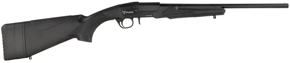 The Puma Camper break action shotgun features a 3-barrel 18.5" set 12, 20 and 410 gauge. The synthetic stock has a cavity for storing emergency items and a swivel stud. This model has a black matte finish.