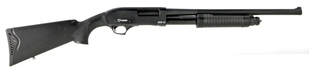 The Puma PBF-12 features a chrome-lined barrel with a front blade sight and a modified choke. It utilizes a black synthetic stock, push button safety, and a single trigger. This model has an overall black finish.