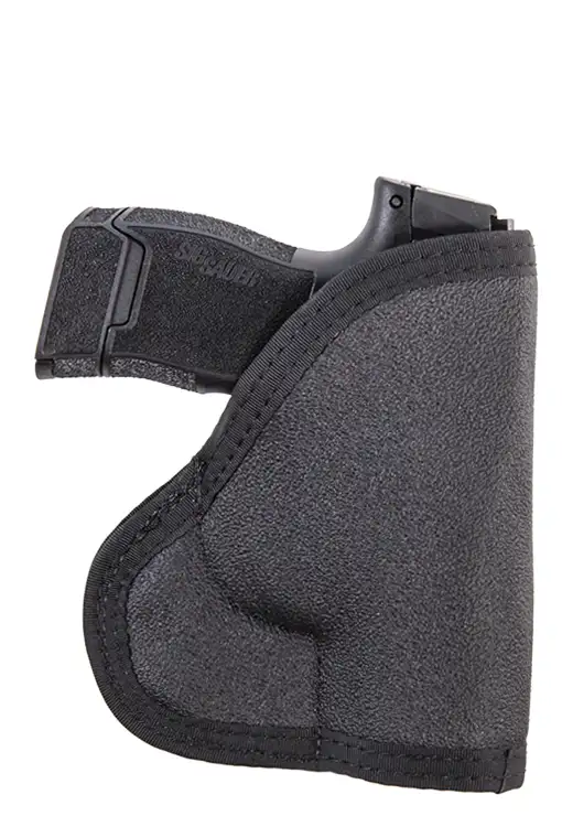 The High Speed Gear Pocket holster is designed to conceal carry a subcompact handgun in your pocket. The rubberized exterior grips the inside of the pocket, keeping the holster in place when drawing. Flared wing is designed to catch inside pocket to further hold holster in place when drawing. Features double-needle edge binding on all edges. Fits most small (J frame) revolvers and subcompact semiautomatic pistols.