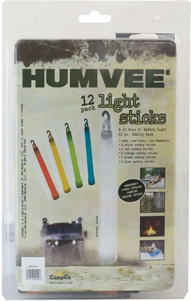 The 12 Piece Light stick Family Pack contains 4 white, 2 blue, 2 red, 2 green and 2 orange light sticks. These light sticks last for 8-12 hours and are great for emergencies, power outages, camping and marine sports. Light sticks are non-toxic, non-flammable and weatherproof.