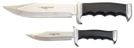 The HUMVEE Bowie Knife Combo Set comes with large and small mirror polished, stainless steel blades with a black Pakawood handle. Set includes nylon sheath.