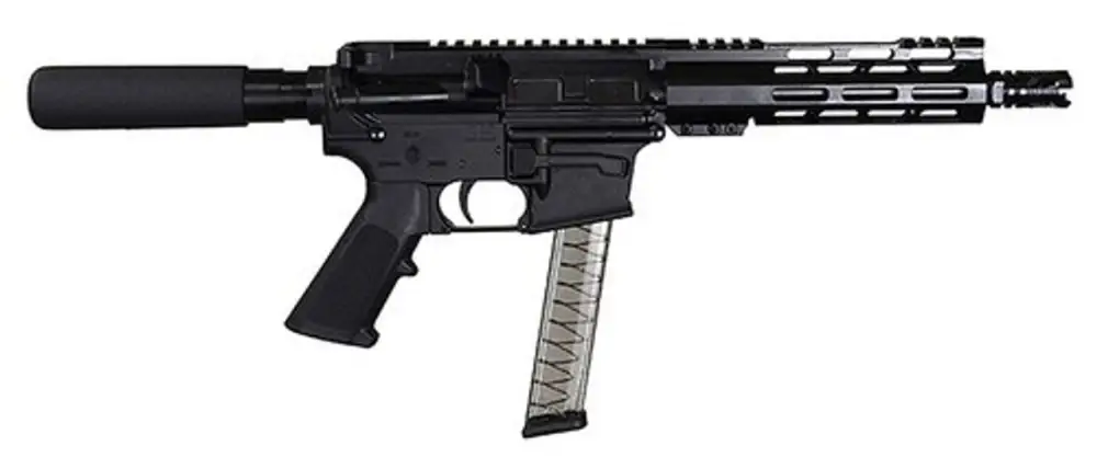 I.O.'s M215 Pistol is compatible with Glock-style 9mm magazines. The upper and lower receivers are made from 7075-T6 aluminum forgings with a Type II Anodized finish, and the high grade ordnance steel 9mm bolt is nitrided for corrosion and wear resistance. The lower uses a mil-spec lower parts kit and features a functional Last Round Bolt Hold Open. The M215 ML features an 8.5" barrel with a 7" M-Lok free-float handguard and mil-std 1913 top rail. The pistol buffer tube allows for the addition of an arm brace. This model has a black finish and includes one magazine.