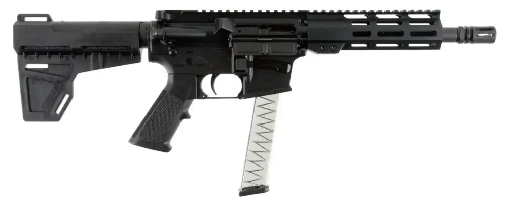 I.O.'s M215 Pistol is compatible with Glock-style 9mm magazines. The upper and lower receivers are made from 7075-T6 aluminum forgings with a Type II Anodized finish, and the high grade ordnance steel 9mm bolt is nitrided for corrosion and wear resistance. The lower uses a mil-spec lower parts kit and features a functional Last Round Bolt Hold Open. The M215 ML features an 7.5" barrel with a 7" M-Lok free-float handguard and mil-std 1913 top rail. The pistol buffer tube allows for the addition of an arm brace. This model has a black finish, KAK brace and includes one magazine. Glock magazines can be used with this pistol.