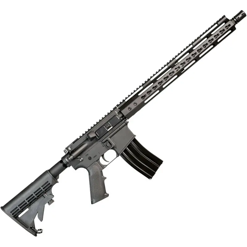 I.O.'s M215 Tactical rifle features a 15" KeyMod rail, Mil-Spec trigger group, and a forged 7075-T6 aluminum upper and lower receiver. It also has a 16" M4 profile barrel and 6-position buttstock. This model has a black finish.