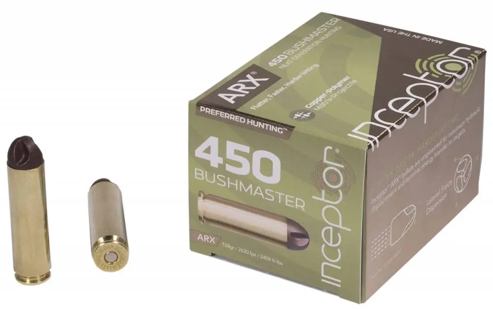 The Inceptor Preferred Hunting line features the patented ARX bullet, a non-expanding projectile that is lighter, faster and has low recoil while retaining a flat trajectory. Its fluted design ensures exceptional reliability and terminal performance. The ARX is a universal hunting projectile. The projectile is injection-molded from a specially blended polymer-copper matrix that is designed to be tough enough to penetrate soft tissue. And when it encounters tougher barriers, it breaks apart to reduce the risk of over-penetration.