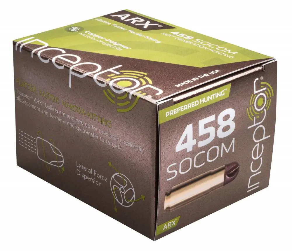 Inceptor's Preferred Hunting line, features the patent-pending Inceptor ARX projectile. The non-expanding projectile is light, fast and has low recoil while retaining a flat trajectory. Its fluted design ensures exceptional reliability and terminal performance while diminishing the possibility of over-penetration.
