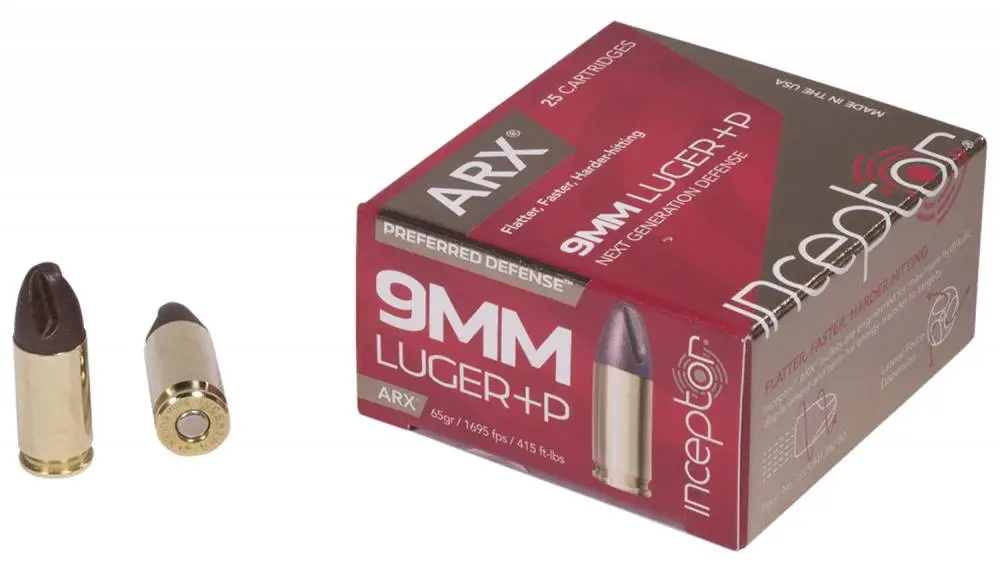 Inceptor's Preferred Defense ARX ammo transfers energy to the target. The non-expanding ARX is injection molded from a specially blended polymer-metal matrix. It is designed to penetrate most intermediate barriers without deformation and consistently achieves its terminal effect in soft targets and tissue. As the bullet penetrates it tumbles in a controlled, predictable fashion that delivers consistent terminal performance that rivals conventional hollow point designs. It is light weight; thereby producing reduced recoil and allowing for faster on-target follow up shots. This 9mm +P model has a 65 grain weight and comes packaged 25 rounds per box, 10 boxes per case.