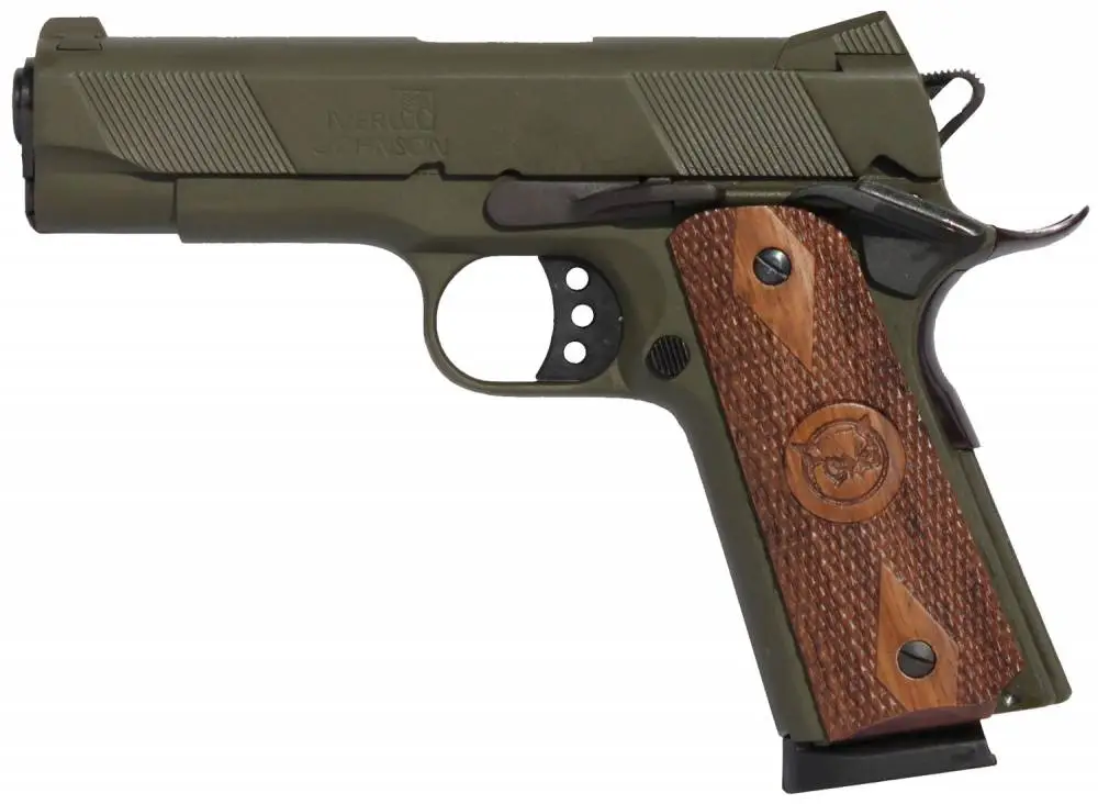 This 1911 Hawk Commander model features an OD green finish, 4.25" barrel, Novak LoMount rear sight & dovetail front sight, front/rear angled serrations, and walnut grips.