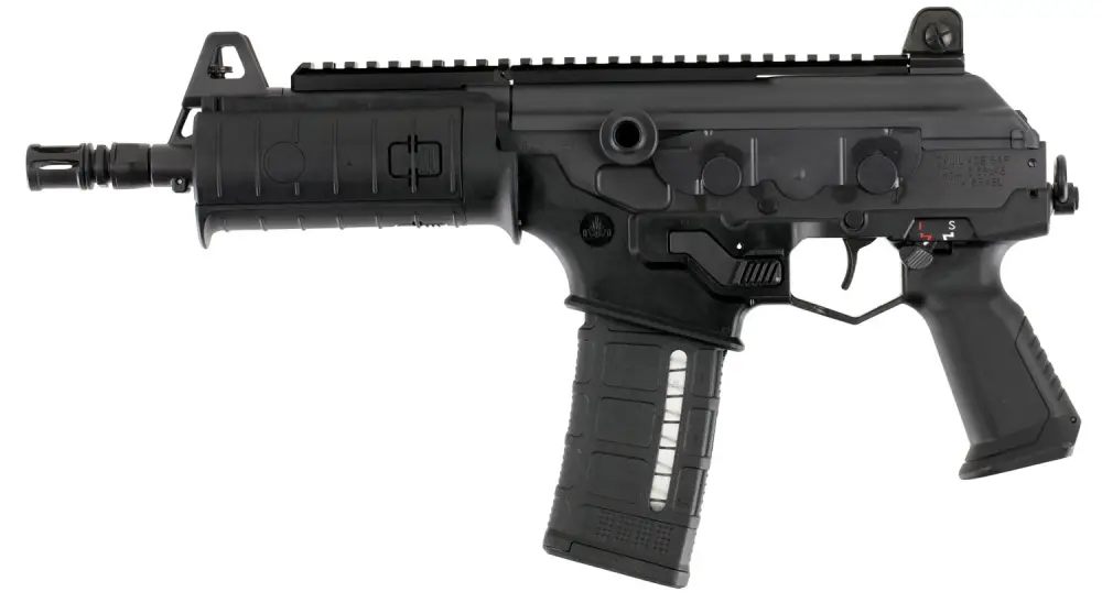 The modernized Galil Ace is based upon the reliable mechanism of the original Galil assault rifle, and continuous improvements have resulted in an extremely reliable and highly accurate Galil Ace. Modernizations include weight reduction due to use of modern polymers, increased magazine compatibility, and a left-side charging handle (reciprocating) allowing for weak hand operation. The milled steel receiver is topped with a two-piece, full-length Picatinny rail, and it has a Picatinny style tri-rail forearm with built in, slide on/off rail covers with pressure switch access. The Galil Ace features fully adjustable iron sights with a Tritium front post and 2-dot Tritium rear aperture. This model is chambered for 5.56 NATO (5.56x45mm) ammo and is compatible with NATO STANAG magazines. It has an 8.3" cold hammer-forged, CrMoV, chrome-lined barrel with a 1:7" twist.