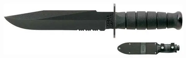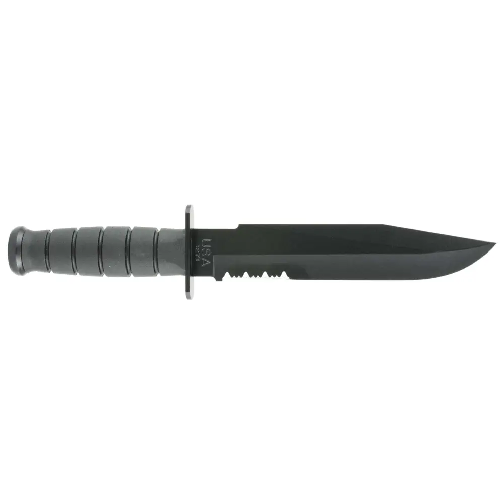 Ka-Bar's full-size Fighting/Utility knife with a black blade and black Kraton G handle. The clip point blade is a classic shape and very practical. The shape seems to have a portion of the spine of the blade clipped off which brings the blade point lower for extra control and enhances the sharpness of the tip. It provides ample "belly" in the blade for slicing or skinning and a good tip for inserting in and under things that need to be cut. You will often find a false edge with the clip point. This knife is easy to sharpen, plain carbon steel used in knife making. It's proven to be one of the most popular steels used in Ka-Bar knives. It available with a plain or partially serrated edge.