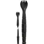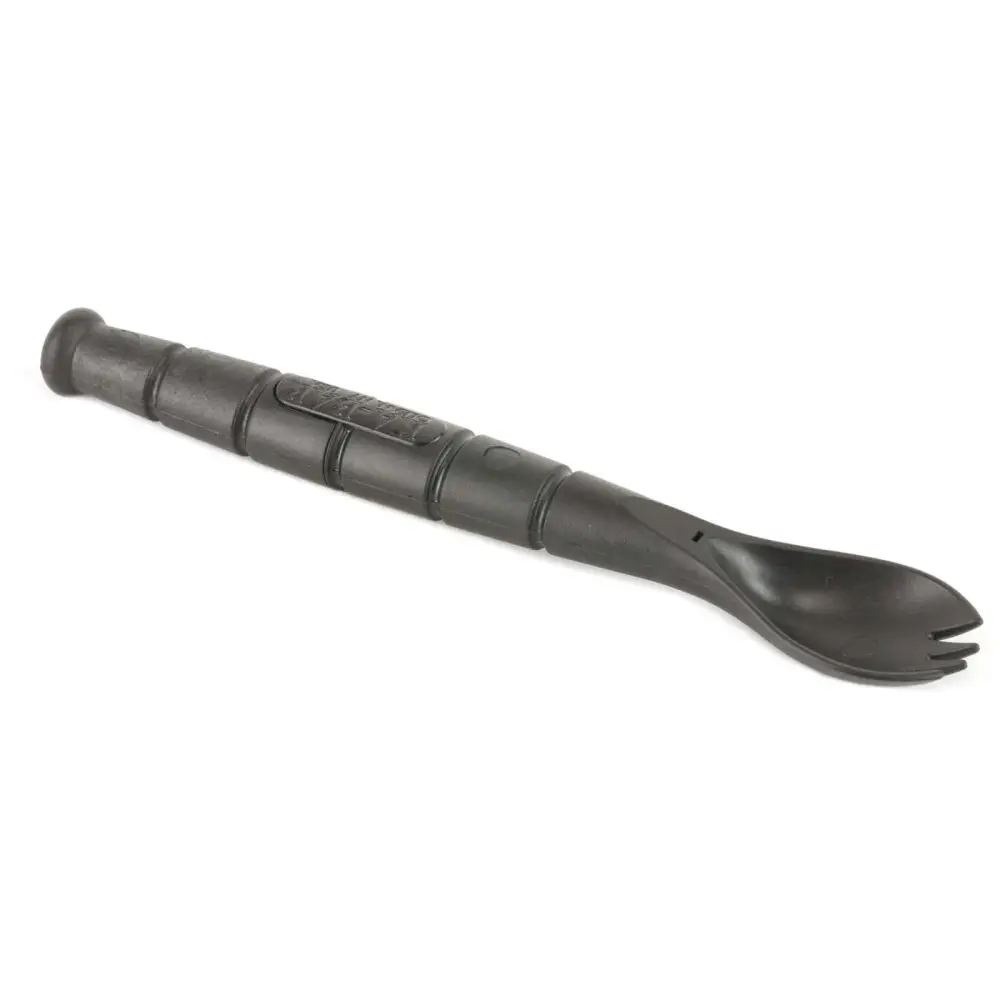 KA-BAR's Tactical Spork is made from food and water approved Grilamid polymer. The fork/spoon combo also houses a knife in the handle. Separate the handle to access the 2.5" serrated blade. It has a black finish.