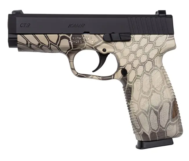This firearm features a Kryptek Camo finish, a cerakote armor black slide, and white dot rear and pin-in polymer front sight.