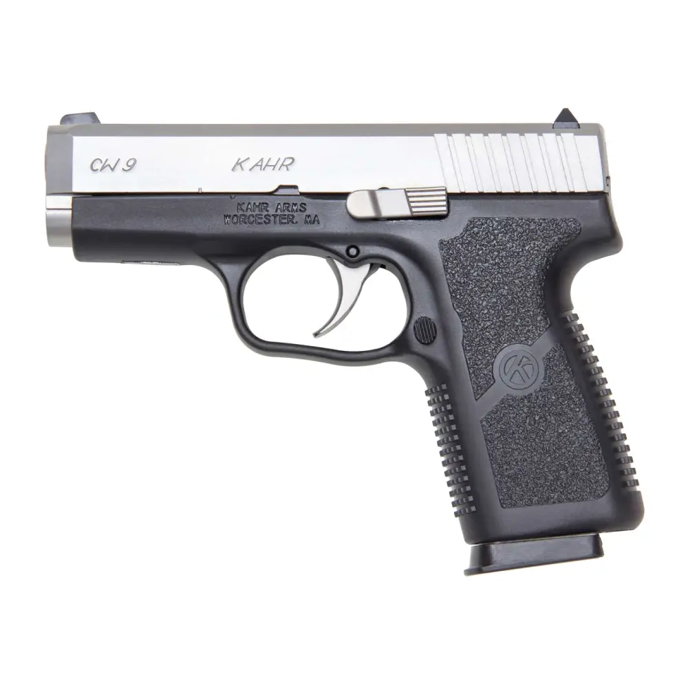 The CW9 from Kahr Arms is a 9mm double action pistol. This firearm features a black polymer frame and grips, along with a 3.5 inch barrel and a stainless steel slide. It also comes equipped with adjustable sights and one seven round magazine.