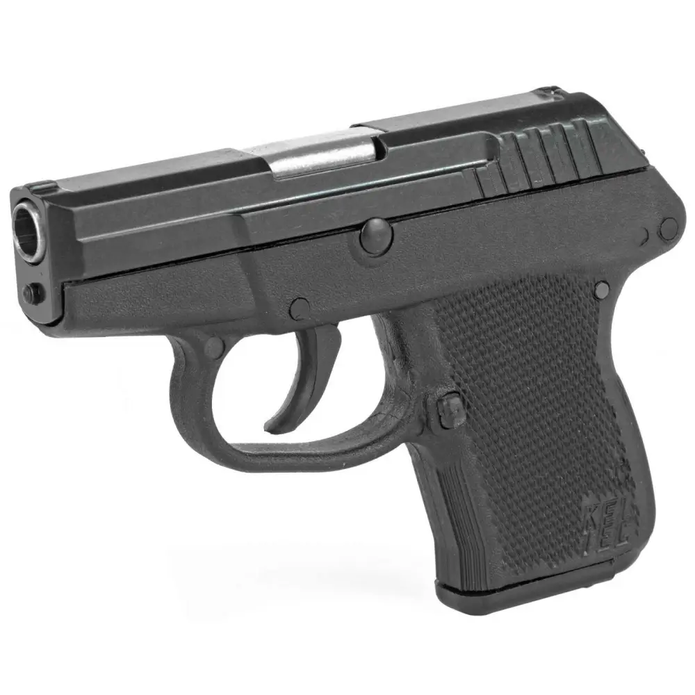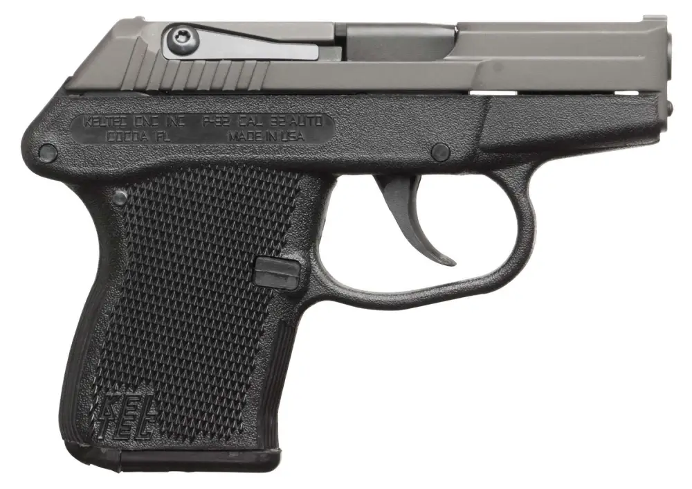 The P-32 has a perceived recoil and practical accuracy comparable to much larger guns. The barrel is made of SAE 4140 ordnance steel, heat treated to 48 HRC. The slide is also 4140 steel. The rectangular frame is machined from solid 7075-T6 aluminum and houses the firing mechanism. The trigger connects via a transfer bar to the hammer. The hammer is driven by a novel free floating extension spring. The light weight firing pin transmits the energy of the hammer to ignite the primer. After firing, the hammer block holds the hammer away from the firing pin, providing a mechanical safety. The P-32 is available with a black parkerized or blued slide finish and a variety of grip color options. The 32 ACP magazine has a 7-round capacity.