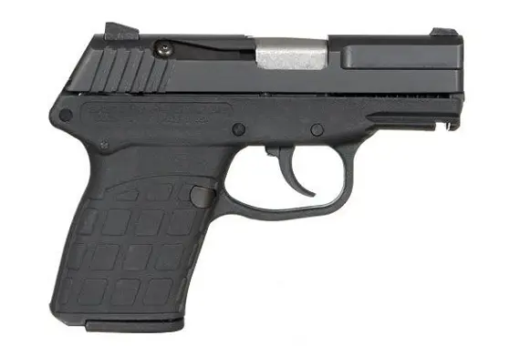 The PF-9 retains the best features from Kel-Tec's P-11 and P-3AT pistols combined into a flat (0.88" wide) and light single stack 9mm configuration. The PF-9 is nearly identical to the P-11 in length and height and shares the same exterior controls. The shorter trigger system with integral hammer block and the extraction system are adapted from the P-3AT. The rear sight is adjustable for windage with the supplied allen wrench as well as for elevation with the use of shims (not included). It includes a 7-round rectangular magazine supplied with a finger extension base plate and numbered holes. It has a single notch under barrel MIL-STD-1913 Picatinny rail.The P-F9 is available with black polymer grips and either a black parkerized or blued slide.