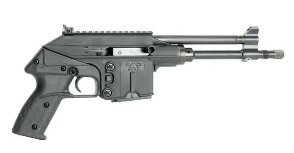 The PLR-16 is a gas operated, semi-automatic pistol chambered in 5.56mm NATO caliber. It was designed and intended as a long range target and hunting pistol. It has a conventional gas piston operation and utilizes the proven M-16 breech locking system. The rear sight is adjustable for windage. The front sight is of M-16 type. An integrated MIL-STD 1913 picatinny rail will accept a multitude of standard accessories. The muzzle end of the barrel is threaded .5-28 TPI to accept standard attachments such as a muzzle brake. Except for the barrel, bolt, sights and mechanism, the PLR-16 pistol is made entirely of high-impact glass fiber reinforced polymer.