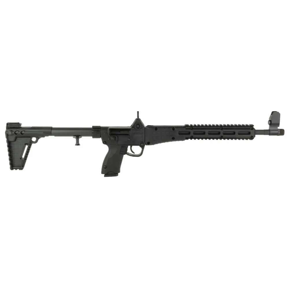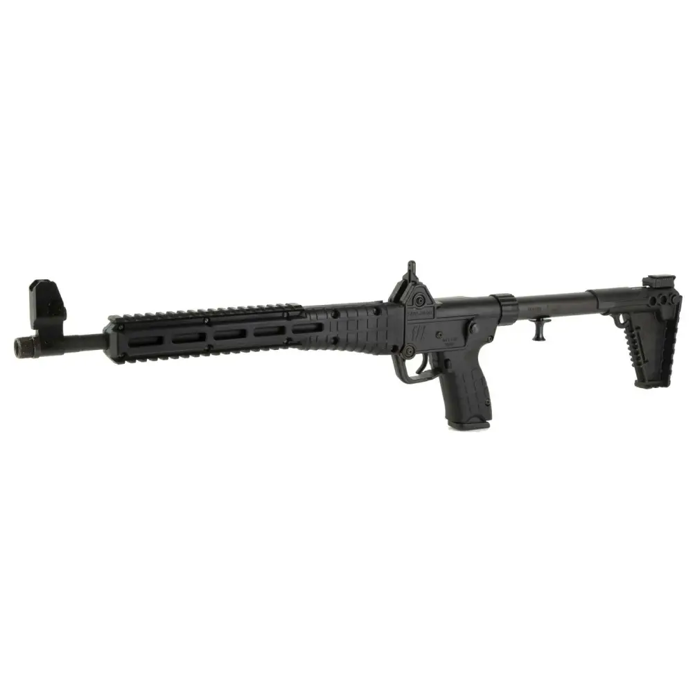 Kel-Tec's semi-automatic Sub-2000 is a rifle chambered for pistol cartridges and can accept most double column handgun magazines. The Sub-2000 is classified as a "sub-rifle" because of its small size, light weight, and the use of a pistol cartridge. It is intended as a compliment to the handgun with which it would have full interchangeability in ammunition and magazines. Easily be disassembled for cleaning or inspection without tools, it is ideal for backpacking trips and situations where space and convenience are paramount. By rotating the barrel upwards and back, the Sub-2000 can be instantly reduced to a size of 16.25" x 7" for ease of storage. The Sub-2000 has a 3-position stock providing an adjustable LOP (13-14.25"), and two integrated Picatinny rails on the forend for mounting accessories. The ergonomic charging handle is located under the bolt tube for ambidextrous operation. It has a ghost ring rear sight and an adjustable front sight with a removable T6 6061 aluminum housing. This model comes with a 15-round magazine. It is compatible with Glock 22 mags.