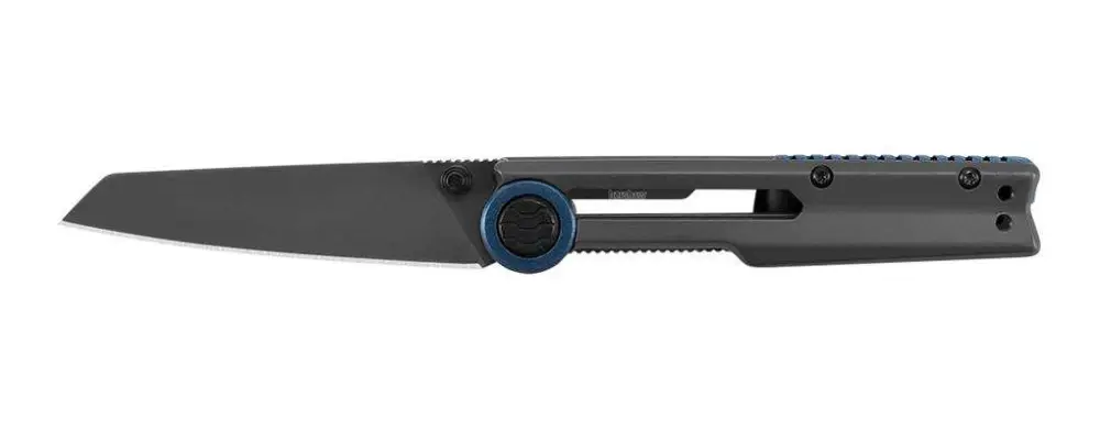 This sci-fi-inspired Decibel slim, linear design is emphasized by dark matte-gray, titanium-carbo-nitride coating on both blade and handle. The dark-gray finish is offset by an aluminum pivot collar and backspacer, both anodized in bright blue. Its blade is quality 8Cr13MoV stainless steel and even though the handle is also stainless steel, the discreet Decibel weighs in at just 2.7 ounces. The reversible pocketclip has its own decorative cutouts, echoing the lines of the knife. The Decibel is a fully manual knife, but can be opened one-handed using the thumb stud.