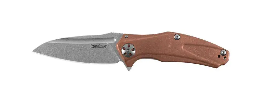 Like other Natrixes, this one features a drop-point blade that offers solid performance. But it also offers upgraded D2 blade steel. This high-carbon tool steel is highly wear resistant, tough, and offers excellent edge retention. The stonewashed finish on the blade goes perfectly with its intriguing copper handles. Since copper is denser than stainless steel, this smaller knife has some heft. Accessed with the built-in flipper, Kershaw's KVT ball-bearing opening makes it easy to open the knife one-handed. An oversized pivot provides an attention-grabbing detail on the front of the knife, while Kershaw's patented Sub-Frame Lock secures the blade and provides a dramatic, contrasting line on the back. A decorative backspacer adds another embellishment. A custom-designed deep-carry pocketclip echoes the lines of a special recess machined into the handle to complete this good-looking knife.