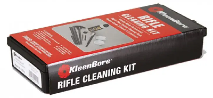 Kleen-Bore Rifle Celaning Kit features a four section, 30" steel rod with swivel handle and plastic muzzle guard. It includes accessory adapters, double ended nylon bristle gun brush, phosphor bronze bore brush, slotted patch holder, 2 oz. formula 3 Gun conditioner, 100 percent cotton cleaning patches, and silicone gun and reel cloth.