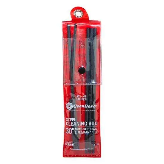 Kleen-Bore multi-section rods are packaged in tough, compartmentalized vinyl pouches that are reusable and easy to store. Calibers 22-45 handgun/rifle. Four section, 30" steel rod with black oxide finish and folding swivel handle. Slotted patch holder. Accessory adapter (#8-32thrd.)