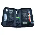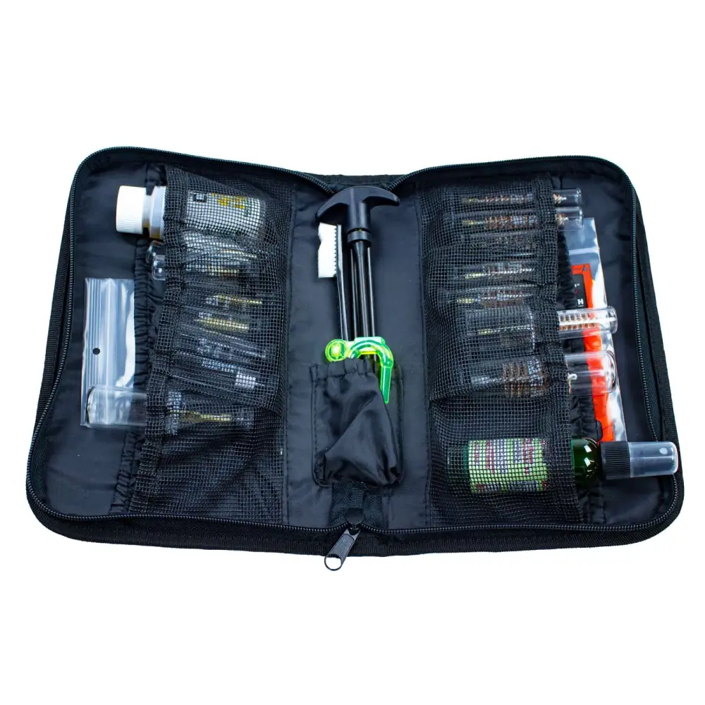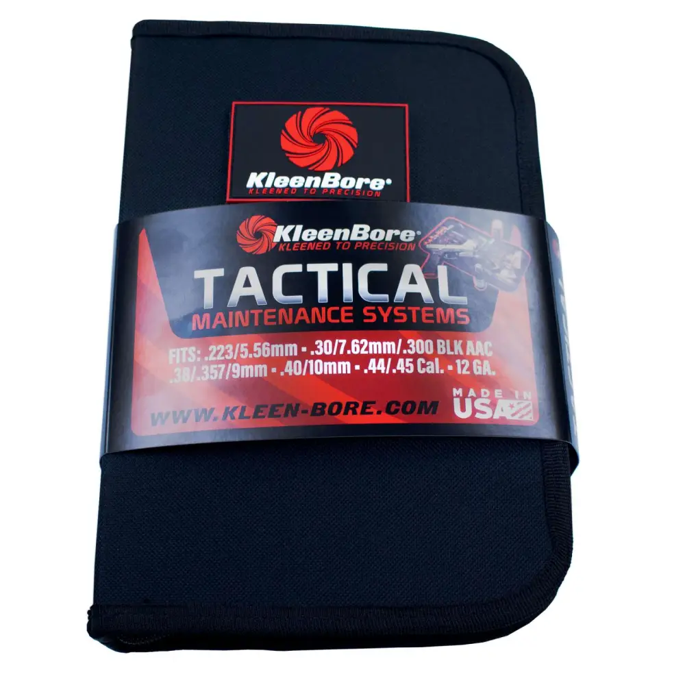 Developed by law enforcement for the wide selection of guns they use, this Tactical Maintenance System cleaning kit is also idea for those who own multiple guns. It includes tools to clean all the popular law enforcement firearms including: .223/5.56mm, .30/7.62mm, .38/.357/9mm, .40/.41/10mm .44/45 calibers and 12-gauge. This kit is equipped with the following: (5) piece steel universal cleaning rod with muzzle guard, (5) phosphor bronze brushes, (4) brass patch jags for professional bore cleaning results. For .223/5.56mm, .30/7.62mm, .38/.357/9mm, .40/.41/10mm .44/45 calibers and 12-gauge. This all-inclusive kit cleans handguns, shotguns and rifles, and is conveniently packaged in a durable fabric zippered pouch with internal compartments for efficient storage.