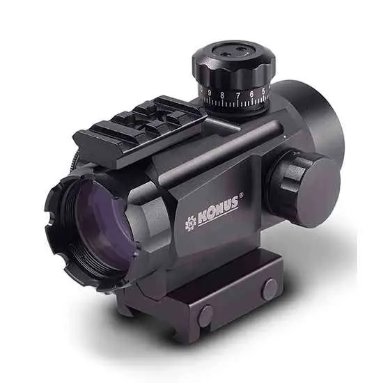 The tactical red dot Konusight is not your traditional dot sight. It features 4 interchangeable reticle patterns that are among the most popular and versatile today. Each of the reticles can be illuminated in both, red and green. In order to accommodate all lighting conditions, you can dial up to 5 different intensities in each color. It also comes with a dual mount that fits a standard style base, as well as 3/8 grooved receivers such as those used on 22s. The look and feel is all about tactical usage.