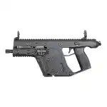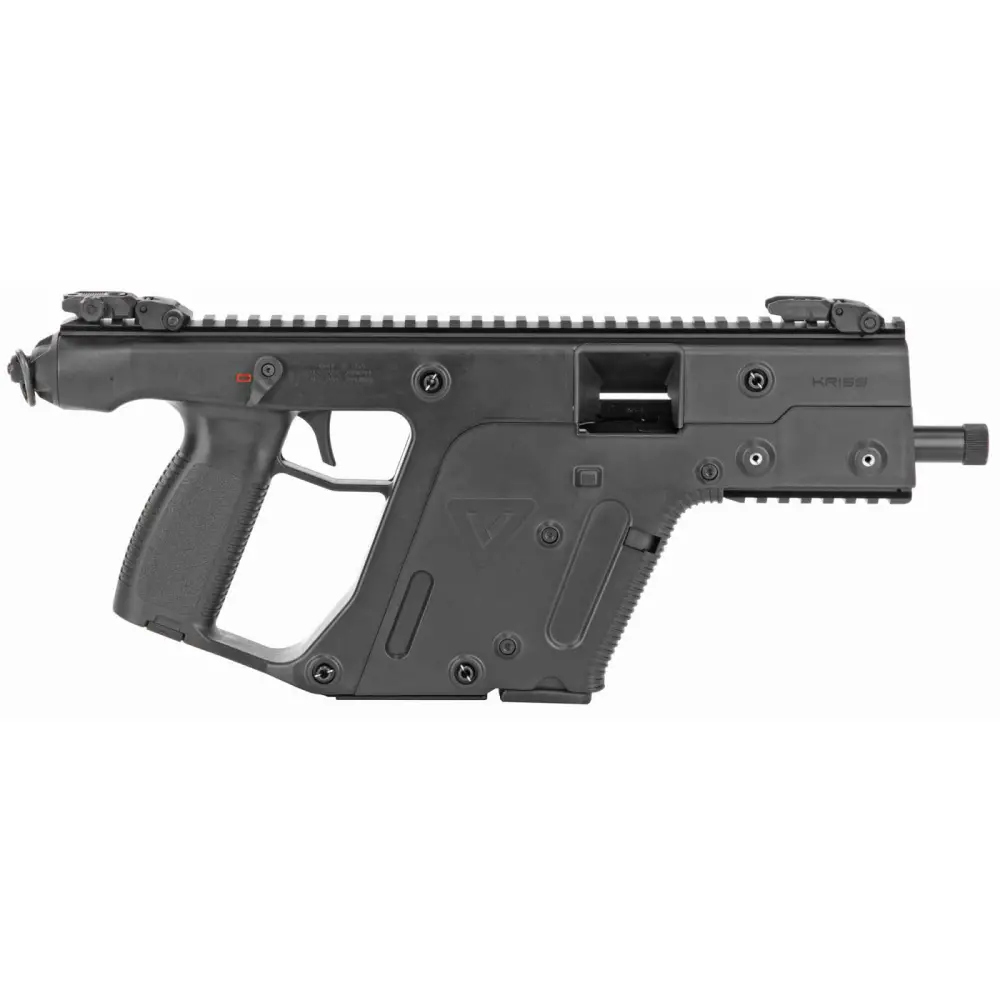 The KRISS Vector Gen II SDP (Special Duty Pistol) is the Non-NFA semi-automatic pistol variant of the KRISS Vector platform. Although it may be small, it still has the same capabilities as its larger counterparts, and is civilian legal in most states. It has an ambidextrous short throw safety lever, and a smooth trigger with an audible and tactile reset. The frame is constructed with advanced polymer composite material, and has a full length mil-std 1913 Picatinny top rail with a mil-std 1913 Picatinny bottom rail. The Vector SDP includes adjustable low-profile front and rear folding sights, and features a 5.5" threaded barrel with a nitride QPQ finish. Standard SDP models have a rear quick detach sling point. This SDP SB model in 45 ACP is compatible with Glock G21 magazines, and has M16x1 LH muzzle threads. It has a black frame and metal finish, and includes a 13-round magazine.