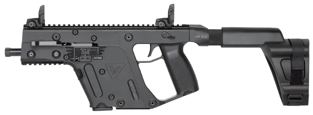The KRISS Vector Gen II SDP (Special Duty Pistol) is the Non-NFA semi-automatic pistol variant of the KRISS Vector platform. Although it may be small, it still has the same capabilities as its larger counterparts, and is civilian legal in most states. It has an ambidextrous short throw safety lever, and a smooth trigger with an audible and tactile reset. The frame is constructed with advanced polymer composite material, and has a full length mil-std 1913 Picatinny top rail with a mil-std 1913 Picatinny bottom rail. The Vector SDP includes adjustable low-profile front and rear folding sights, and features a 5.5" threaded barrel with a nitride QPQ finish. SDP SB models feature the KRISS Vector Pistol Arm Brace by SB Tactical. This SDP SB model in 45 ACP is compatible with Glock G21 magazines, and has M16x1 LH muzzle threads. It has a black arm brace, frame and metal finish, and includes a 13-round magazine.